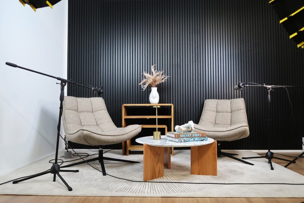 Notre studio est opérationnel et vous attend. Décor chaleureux, éclairage professionnel ambiant et mobilier soigneusement sélectionné : tout est en place pour vos enregistrements dès votre prochaine réservation.