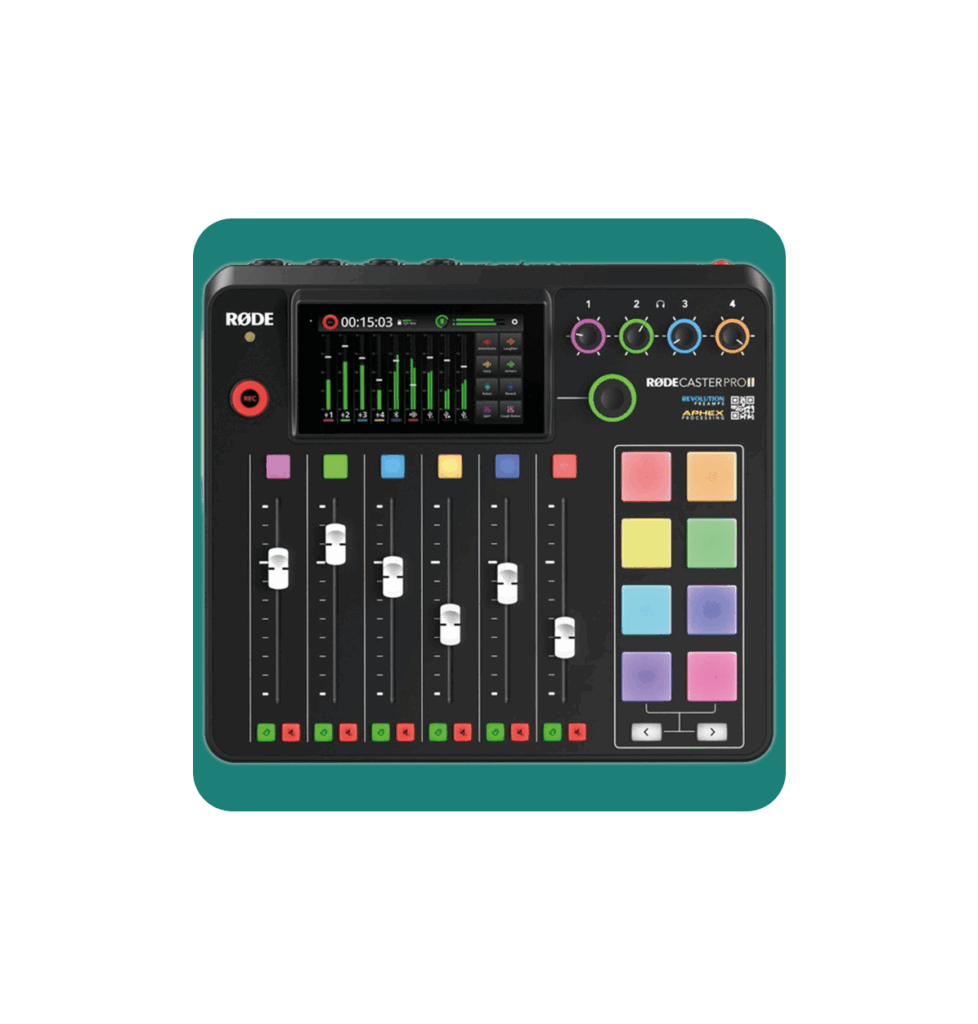 RodeCaster Pro II, éclairages Aputure LSC300D, enceintes de monitoring PSI Audio A25-M,